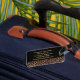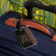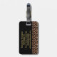 Um Tag à moda da bagagem com uma beira animal do impressão do leopardo em tan, em marrom e em preto. As iniciais na informação da parte dianteira e do contato são indicadas sobre para trás no texto colorido ouro. A cor esquerda da listra pode ser mudada clicando PERSONALIZA-O, EDIT, então FUNDO.