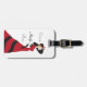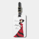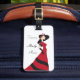 Uma garota de vestido vermelho e preto com luvas pretas compridas