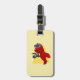 Etiqueta de bagagens com design, ilustrada com um pinguim que voa num plano vermelho; ilustrada por Radka Kavalcova/MaxiHarmony
