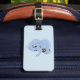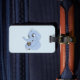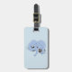 Etiqueta de bagagens com design com uma ilustração de um elefante azul com um rato marrom; ilustrada por Radka Kavalcova/MaxiHarmony