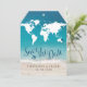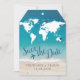 Um casamento na praia de destino salve a data em forma de uma etiqueta de bagagem com um mapa do mundo e coração móvel que você pode colocar em sua localização exata de casamento e uma praia relaxada e uma foto de fundo oceânica. Nosso avião romântico sobe o design, e você pode adicionar seu site de casamento no verso para que os convidados possam começar a planejar seu viagem para seu único local de casamento de aventura. A cor do mapa, do coração, do texto e do avião pode ser alterada no editor avançado, basta clicar em 'personalizar ainda mais'.