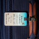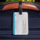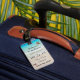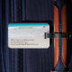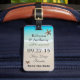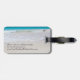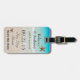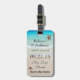 Um casamento perto do mar, salve a etiqueta da bagagem. Uma forma única de informar os hóspedes de que a viagem para um destino tropical está guardada para eles. A água turquesa e a areia das praias são o pano de fundo de textos personalizados de ambos os lados. Adicione o site do casamento ou outras informações sobre um casamento de destino ao fundo.