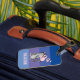 Uma mala adorável para todos os amantes de gatos lá fora. Ele tem quatro faixas de diferentes tons azuis e uma cinza e uma tábua preta vestindo uma bereta te enviando abraços e beijos. Personalize com um nome e será seu. © ArianeC Ilustrações — Todos os direitos reservados