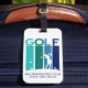 Adicione o nome do clube e a localização a esta atrativa etiqueta de bagagem que contém a silhueta de uma mulher golfista. Faz um novo presente de excelente para a sua liga de golfe ou clube de campo ou para ajudá-lo a seguir seu próprio saco de golfe.