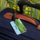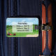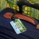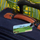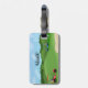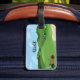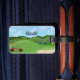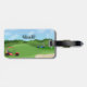 Saia do carrossel da bagagem com uma etiqueta de bagagem de golfe que contém um fundo do campo de golfe com uma armadilha de areia e uma bandeira de golfe, um carrinho de golfe vermelho, um carrinho de golfe azul ambos com bolsas de golfe. Texto estilizado é Golfe. O texto é configurado para seu nome, endereço e número de telefone ou qualquer texto desejado. Presente perfeito para golfista na sua vida! A correia da bagagem de couro estava incluída.