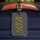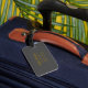 Etiqueta de bagagem de viagem. Uma etiqueta de bagagem é usada para identificar facilmente sua mala caso ela se perca durante o viagem, pois contém suas informações de contato, como nome, número de telefone e endereço, permitindo que alguém chegue a você se encontrar sua mala separada de você.