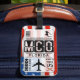 Na Flórida, a etiqueta de bagagem do código do aeroporto MCO ajudará você a localizar sua bagagem no carrossel. A marca também inclui informações autênticas e uma bolsa de detalhes no verso.