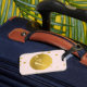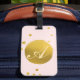 Proteja sua bagagem com esta maravilhosa etiqueta de bagagem em pontos de rosa claro e ouro.