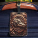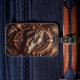 Uma visão de perto da cabeça de um jacaré esculpido, cercado por padrões e texturas intrincadas, criando uma sensação de poder e mistério.