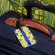 Uma bela etiqueta de bagagem de flores amarelas tropicais contra um fundo azul cobalto. Pronto para ser personalizado com seu nome na frente e número de telefone na parte traseira.