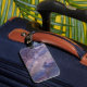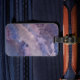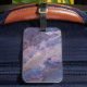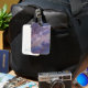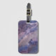 Etiqueta de bagagem com galáxia azul e roxa com estrelas brancas dispersas. Arte original de Ray Bean é aquarela em papel aquoso.