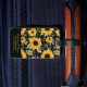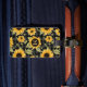 O impressionante padrão de girassol se destaca lindamente contra o fundo preto e cinza de gingham