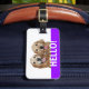 Diga olá!! Características deste design uma fotografia de dois cães de sorriso do golden retriever, com a palavra OLÁ!! no branco em um fundo roxo.