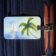 Praia Tropical. Iate no mar Palma num dia ensolarado. Aquarela. A ilustração da aquarela foi desenhada e digitalizada. A imagem será um bom presente e uma decoração interior maravilhosa.