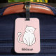Gatinho de conteúdo adorável sentado e sorrindo na etiqueta de bagagem rosa.