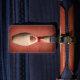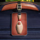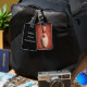 Pino de boliche retrorreflector antigo em fundo vermelho impresso em uma etiqueta de bagagem para a bolsa de boliche. Impressão de alta qualidade num acrílico durável com uma precinta de couro. Personalize com suas informações no verso. Parece excelente na bagagem ou nas bolsas de boliche.