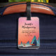 Uma etiqueta de bagagem com um belo design gráfico com um lago pacífico com veados. e pinheiros altos sendo refletidos na água. Estrelas sobrepõem-se.