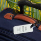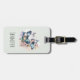 Uma etiqueta de bagagem com um trio de borboletas fluindo entre algumas flores bonito. Esquema de cor rosa azul e verde.