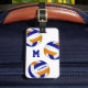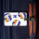 Esta etiqueta de bagagem de vôlei é simplesmente concebida com três volichões dispostos aleatoriamente que têm painéis azuis, laranja e branco - personalizam com o nome do jogador e o monograma na frente, com informações de endereço na parte de trás - por katz_d_zynes