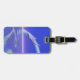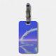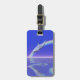Etiqueta de bagagem azul com a minha criação em 3d original de um golfinho mergulhando na água após um arco-íris.