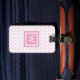 Etiqueta de bagagem personalizada chic, com um padrão elegante de bolinhas cor-de-rosa e branco roxas, com um monograma inicial quadrado em negrito. O inverso tem um fundo cor-de-rosa com texto branco clássico para os seus detalhes de contato. Personalize com a sua inicial.