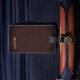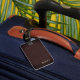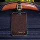 Olhar de couro marrom moderno, minimalista, Tag monogrammed masculino da bagagem do viagem. Nome Monogrammed no canto inferior dianteiro no taupe com efeito de sombra dimensional da gota. O estilo e as cores de pia batismal podem ser mudados. O falso elegante, luxuoso bronzeia o fundo de couro da textura do teste padrão. A parte traseira tem o mesmo fundo de couro impresso do olhar. O modelo do texto de DIY sobre de volta a adiciona o número do nome e de telefone ou a informações de contacto preferida. Nota: As imagens são imprimidas. Couro nao real. Na moda, Tag executivo da bagagem do estilo para ele.