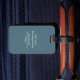 Etiqueta de bagagem personalizada com um padrão feito com raposas de laranja bonitinhas e felizes. Fundo verde escuro. Pequenos cogumelos e folhas espalhados. Um círculo branco colocado sobre o topo com seu nome e dentro inicial monograma.