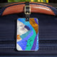 Ele é de acrílico, muito bonito e chegou antes do previsto. Impressão muito boa e cores firmes.