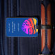 Esta design apresenta uma monstera tropical colorida, folhas verdes, e uma beleza natural com cabelo encaracolado preto, sobre fundo azul marinho. Personalize com seu nome e informações de contato. Viagens seguros!