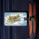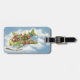 Etiqueta de bagagem fácil de personalizar, basta adicionar suas informações! Ilustração vintage com tema de viagem e transporte de Natal, apresentando um alegre Papai Noel pilotando uma aeronave antiga com hélice no céu com elfos, brinquedos, bonecas, presentes embrulhados e uma árvore de Natal na asa. Eles estão pilotando o avião antigo através das nuvens brancas e fofas e estrelas no céu azul sobre uma vila encantadora e floresta com árvores cobertas de neve na temporada de inverno.