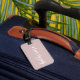 Etiqueta para bagagem personalizada com nome em caligrafia personalizada em fundo rosa empoeirado.