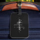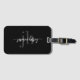 Em direção a um estilo simples com recurso de designer, este design de etiqueta de bagagem moderno apresenta seu nome escrito em um roteiro branco de caligrafia manuscrito com caudas à esquerda e à direita para adicionar uma aparência de na moda. Sua primeira e última iniciais são apresentadas num rosto moderno de serifa industrial em ricas cinzas escuras sob a caligrafia com um sofisticado fundo preto. O resultado é elegante para você! NOTA: ao personalizar seu nome na frente do cartão, deixe os símbolos de caixa antes e depois do seu nome. Isto é o que faz com que as bonitas caudas fiquem impressão antes e depois do seu nome.