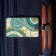 © Veronique Charron/Apple selvagem. Esta imagem de padrões circulares caracteriza cores do azul e do ouro. A imagem tem um tan colorido, fundo modelado floral.