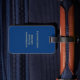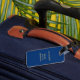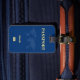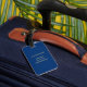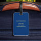 Etiqueta de bagagem de passaporte azul e amarelo com mapa mundial. Personalize-o com suas informações de contato. Excelente para um piloto, férias ou viajante frequente.