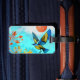 Este lindo design retrata um pássaro azul e dourado fazendo uma aterrissagem em uma árvore ouro com um belo céu de muitas cores azuis e um sol laranja ousado.