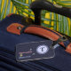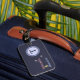 Um design azul agradável e moderno para identificar os pertences do casal, acrescentando os nomes dos viajantes e as informações iniciais