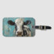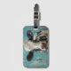 Uma etiqueta de bagagem fofa para amantes de vacas que apresentam uma vaca de raça Holstein negra e branca em frente a uma parede de madeira pintada de azul.