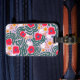This luggage tag features a vibrant, playful floral pattern designed in a contemporary "folk art" or "scandi" style. Bold red poppies with dark blue centers. Deep forest-green fern-like leaves that curve around the primary flowers, creating a sense of movement. Small yellow five-petal flowers, tiny blue berries, and wispy white organic shapes that add brightness.