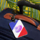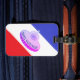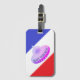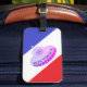 Etiqueta de bagagem com um prato voador e texto|"Boa Viagem" que pode ser personalizado. Este adorável prato voador tem listras azuis, brancas e vermelhas como fundo.