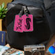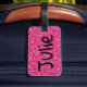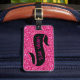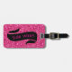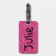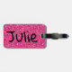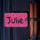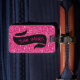 Etiqueta de bagagem com 'look' cintilante cor-de-rosa e faixa preta para nome.