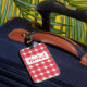 Bela etiqueta de bagagem personalizada, padrão de gingham vermelho e branco, é um design clássico que contém um aspecto controlado ou xadrez de búfalos, design lindo e colorido. Compre uma hoje!