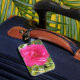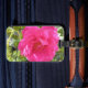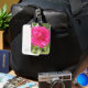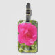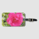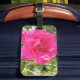 Uma etiqueta de bagagem com uma foto de uma rosa rosa rosa.