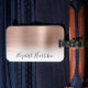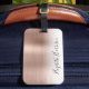 Etiqueta de bagagem monograma elegante com fundo de rosa de ouro embebido em ombre. Personalize com seu nome em um script contemporâneo.