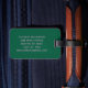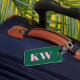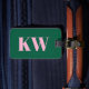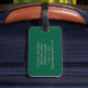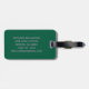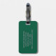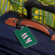 Esta etiqueta de bagagem apresenta suas iniciais e informações de contato em rosa sobre um fundo verde.