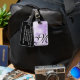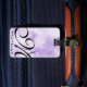 etiqueta de mala personalizada com padrão de mármore roxo com tira de couro: monograma e nome de grandes scripts