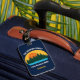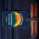 Belo reencontro familiar no lago de férias etiqueta azul de bagagem apresentando as bonito águas azuis sob a floresta de árvores e o pôr do sol de laranja legal. Etiquetas bonitas de sacos de campismo para o seu grupo de excursões naturais ou selvagens.