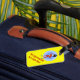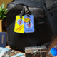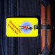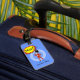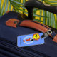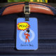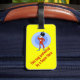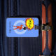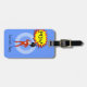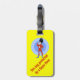 Mala divertida, com um tema super-herói de desenho animado. Feito em azul, amarelo, vermelho e preto com um super-herói de desenho animado para proteger sua bolsa. Personalize o texto para ler o que você quer. Etiqueta de bagagem de excelente para rapazes.