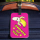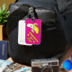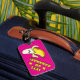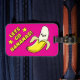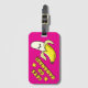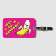 Etiqueta de bagagem adorável, com um desenho animado fofo, uma banana amarela feliz kawaii com os sorrisos mais doces, grandes olhos redondos e metade descascada. Acima dele, em letras amarelas, com uma sombra negra lendo 'Vamos Bananas!' Duas estrelas amarelas brilhantes são de ambos os lados das palavras.