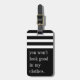 Tire as mãos dessa bolsa! Dissuadam os ladrões de bagagem com esta etiqueta engraçada em preto e branco clássico que torna a sua mala fácil de detectar. "Você não ficará bem em minhas roupas" aparece em letras brancas embaixo de uma borda branca listrada. Personalize com seus detalhes de contato no verso.