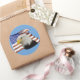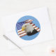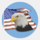 Uma imagem da cabeça de uma águia careca sobre uma bandeira americana acenando em uma brisa.